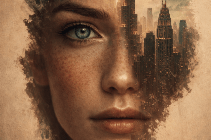 How to create with Google Gemini / AI at Meta Promte Cinematic double-exposure thriller poster, side-profile silhouette of a young woman facing right, hair tied back, her profile filled with a dark futuristic city skyline at night. Inside the silhoue...