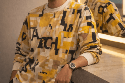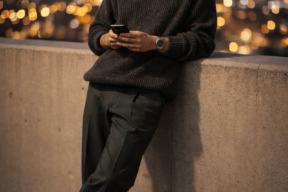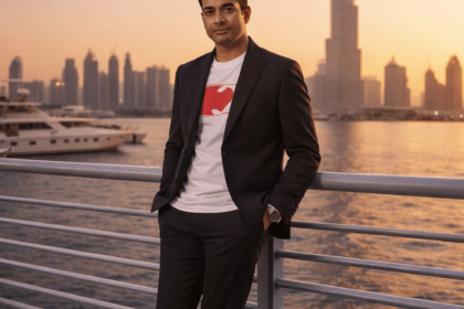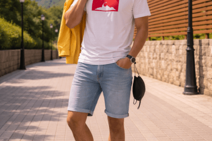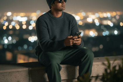ChatGPT/ Google Gemini #promote “Ultra-realistic cinematic street portrait of a young man leaning casually against a tall orange pillar, one leg bent and crossed over the other, left hand in pocket, right hand touching his sunglas...