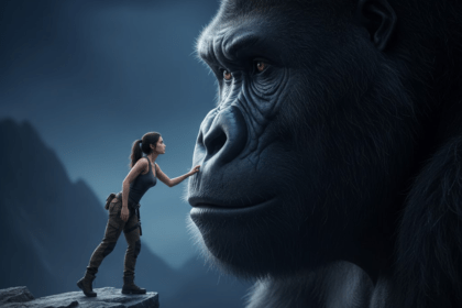 ChatGPT/ Meta AI / Google AI Promte Ultra-realistic cinematic fantasy scene showing a massive giant gorilla face-to-face with a human woman, captured in a dramatic side-profile composition. The enormo...