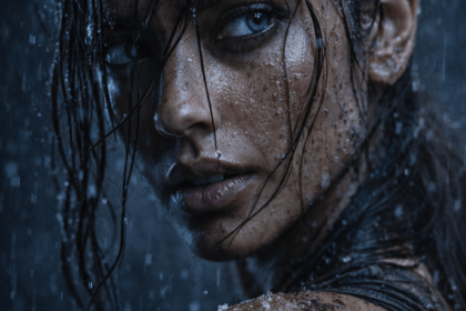 PROMPT #TRENDING Ultra-realistic cinematic close-up portrait of a young person partially submerged underwater, vertical 4:5 composition, face split by the waterline across the forehead, one blue eye sharply in focus above water, c...