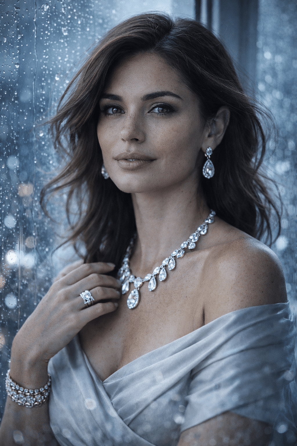 An elegant female model wearing PRODUCT standing by a rainy window, illuminated by soft diffused daylight, captured in a cinematic atmosphere. The scene emphasizes glistening water droplets, fine skin texture, and polished gem reflections. 100mm macro lens with HDR cinematic tone. The image color palette features cool silvers, pale blues, and soft whites. The setting evokes calm intimacy, highlighting the brilliance of the stones against a blurred urban nightscape. Camera settings: f/2.0 aperture, low ISO, crisp contrast.