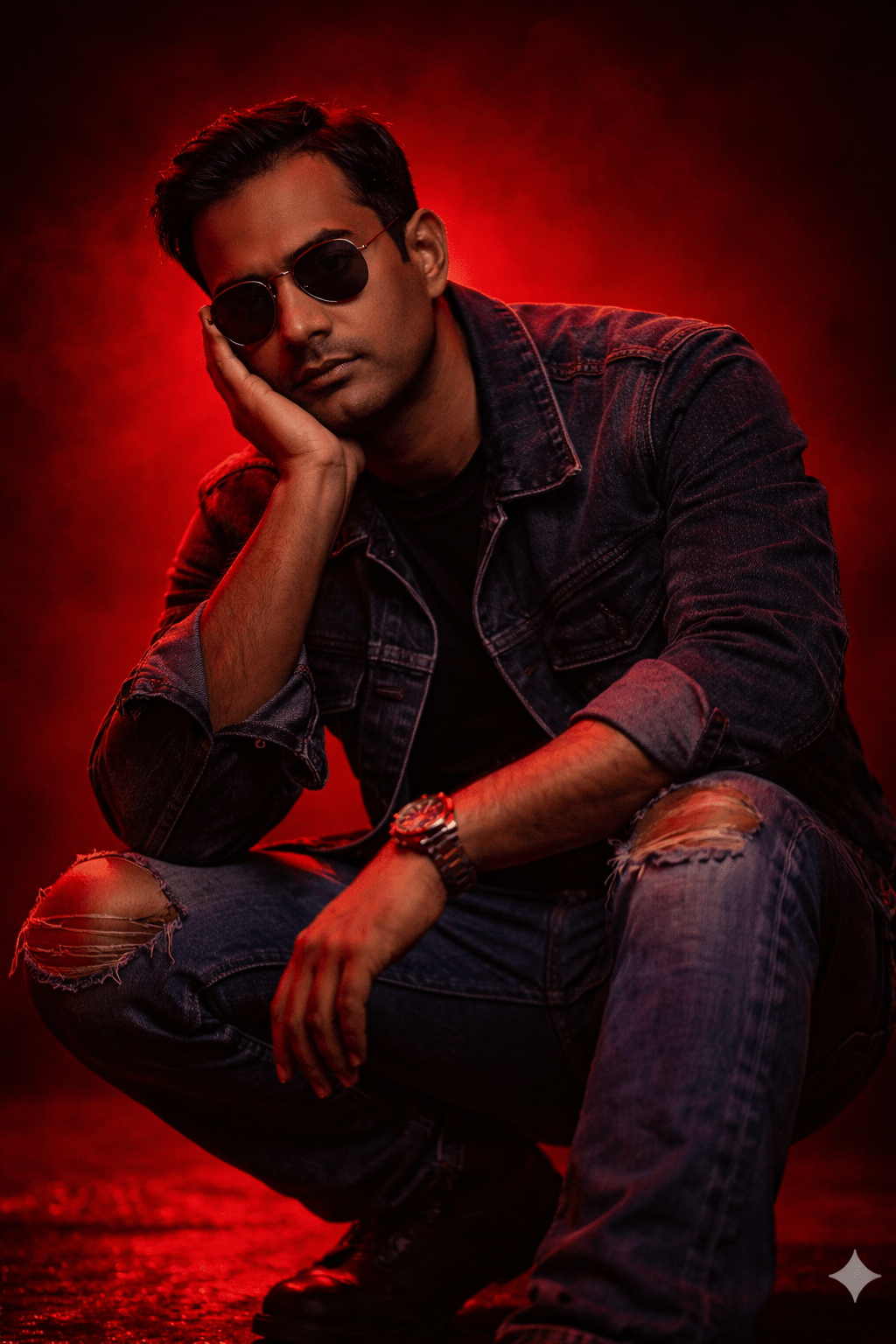 A man in a denim jacket and distressed jeans crouches, his right hand supporting his cheek as he looks directly at the camera through round sunglasses. His left arm rests on his knee. The entire scene is bathed in dramatic, moody red and deep shadow lighting, highlighting textures and creating a strong contrast against a red gradient background. Size 4:5 ratio 100% use my upload reference image image generate