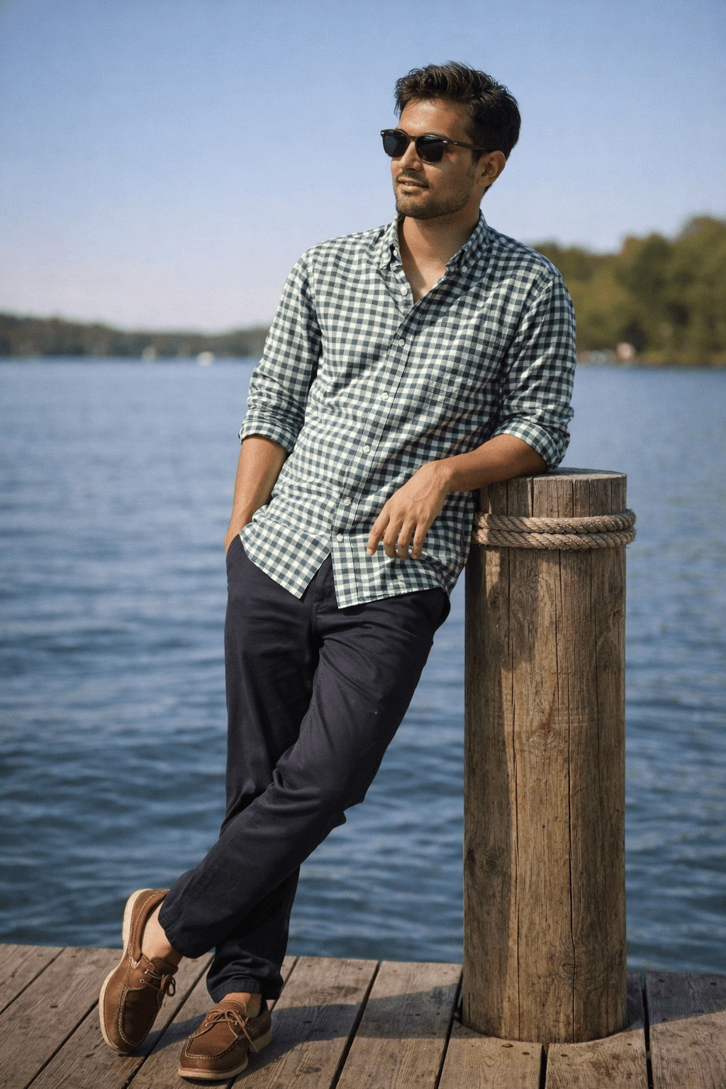 Ultra-realistic high-quality lifestyle photograph of a 19–20-year-old handsome young man with a short beard and sunglasses, leaning casually against a wooden piling on a lake dock, wearing a green-and-white gingham checkered shirt with rolled-up sleeves, dark navy chinos, and brown leather boat shoes, legs crossed at the ankles, looking away with a slight relaxed smile, calm blue lake background under a clear sunny sky, natural bright lighting, cinematic composition, shallow depth of field, photorealistic, 4:5 aspect ratio, 8K resolution. Image generate