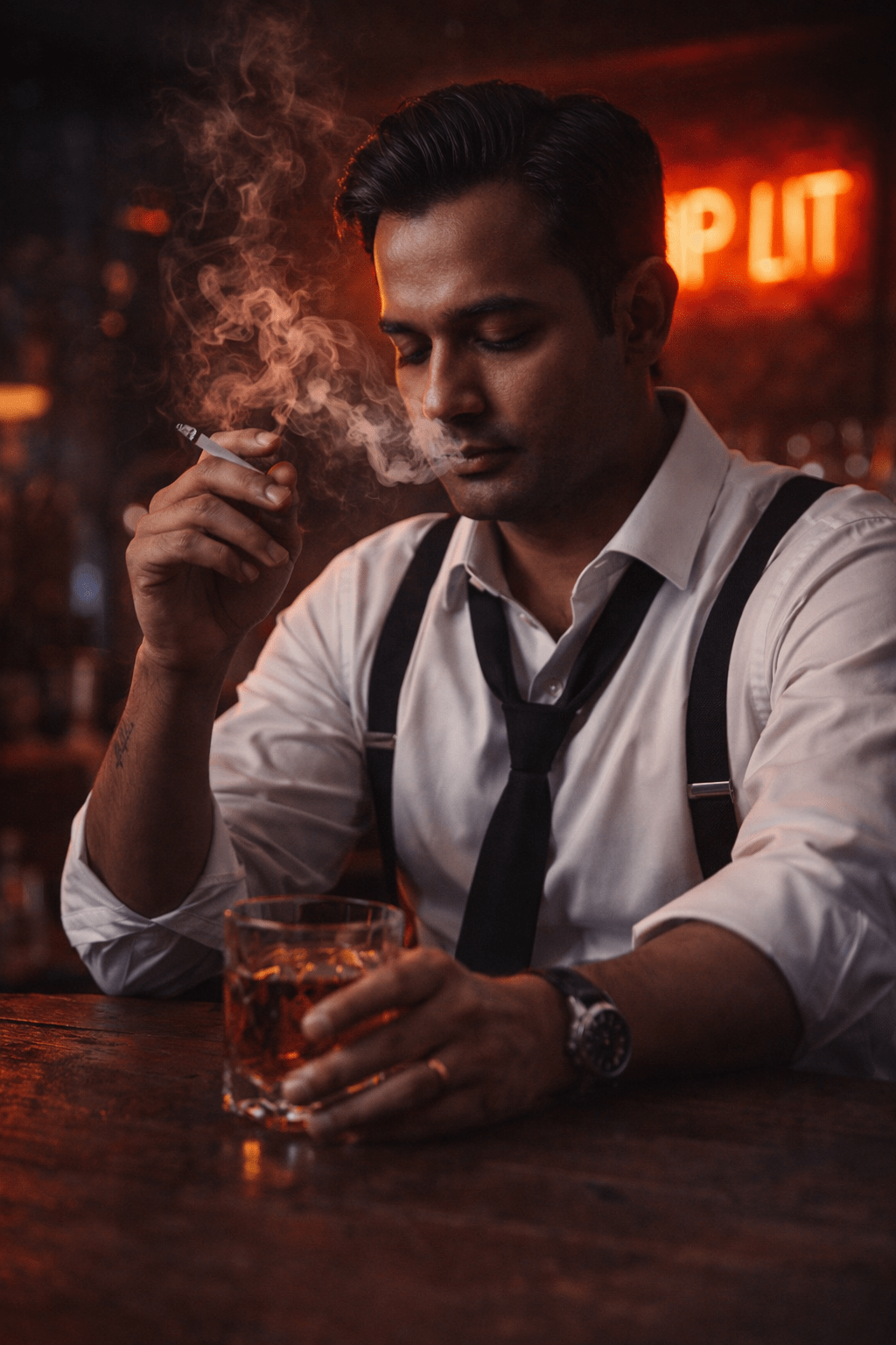 A hyper-realistic, 8k, cinematic mid-shot captures a person from a slightly low-angle perspective, emphasizing their upper body against a moody, dark bar setting. The subject, with uploaded face as reference, has dark, voluminous hair slicked back, and is dressed in a crisp white dress shirt with the top buttons undone, a dark tie, and dark suspenders. Their eyes are closed or cast downwards in a moment of contemplation, as they exhale a plume of highly detailed, volumetric smoke from a cigarette held delicately between the fingers of their right hand. Their left hand holds a textured, cut-glass tumbler filled with an amber liquid, likely whiskey, with ice. A subtle tattoo is visible on their right forearm. The scene is bathed in dramatic, low-key cinematic lighting, predominantly from a vibrant red neon sign in the blurred background that reads “UP LIT”, casting strong red rim lighting and deep shadows across the subject, highlighting the smoke and the contours of their face and clothing. The composition is tight, focusing on the subject’s actions and expression, creating a sophisticated and mysterious atmosphere with highly detailed textures on the clothing, glass, and smoke.