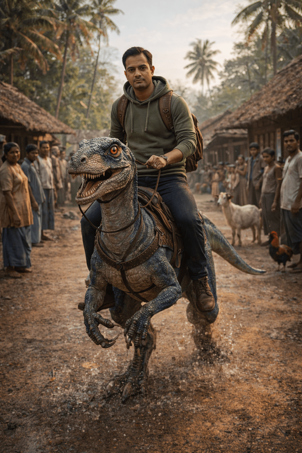 “Ultra-realistic cinematic fantasy scene, vertical 4:5 composition. A handsome young man with styled dark hair and light stubble is riding a small blue velociraptor through a tropical village street. He is wearing an olive-green hoodie, dark blue jeans, brown leather boots, and a brown backpack. The dinosaur has realistic reptile skin texture, sharp teeth, expressive eyes, and is fitted with a leather saddle and reins like a horse.