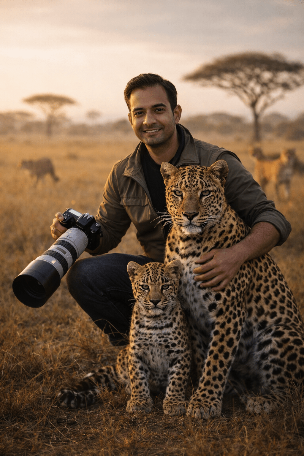 “Ultra-realistic wildlife photography scene of a smiling male wildlife photographer kneeling on open African savanna grassland, holding a professional DSLR camera with a large white telephoto lens in his right hand. His left arm gently supports a full-grown leopard sitting calmly in front of him, while a leopard cub rests in front of the adult leopard between his knees. Both leopards facing the camera. Background shows blurred cheetahs and flat-top acacia trees under warm golden morning light. Shallow depth of field, cinematic color grading, natural tones, hyper-detailed fur, professional National Geographic style, 8K, vertical composition size 4 5 ratio image generate
