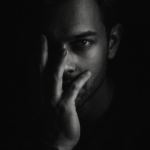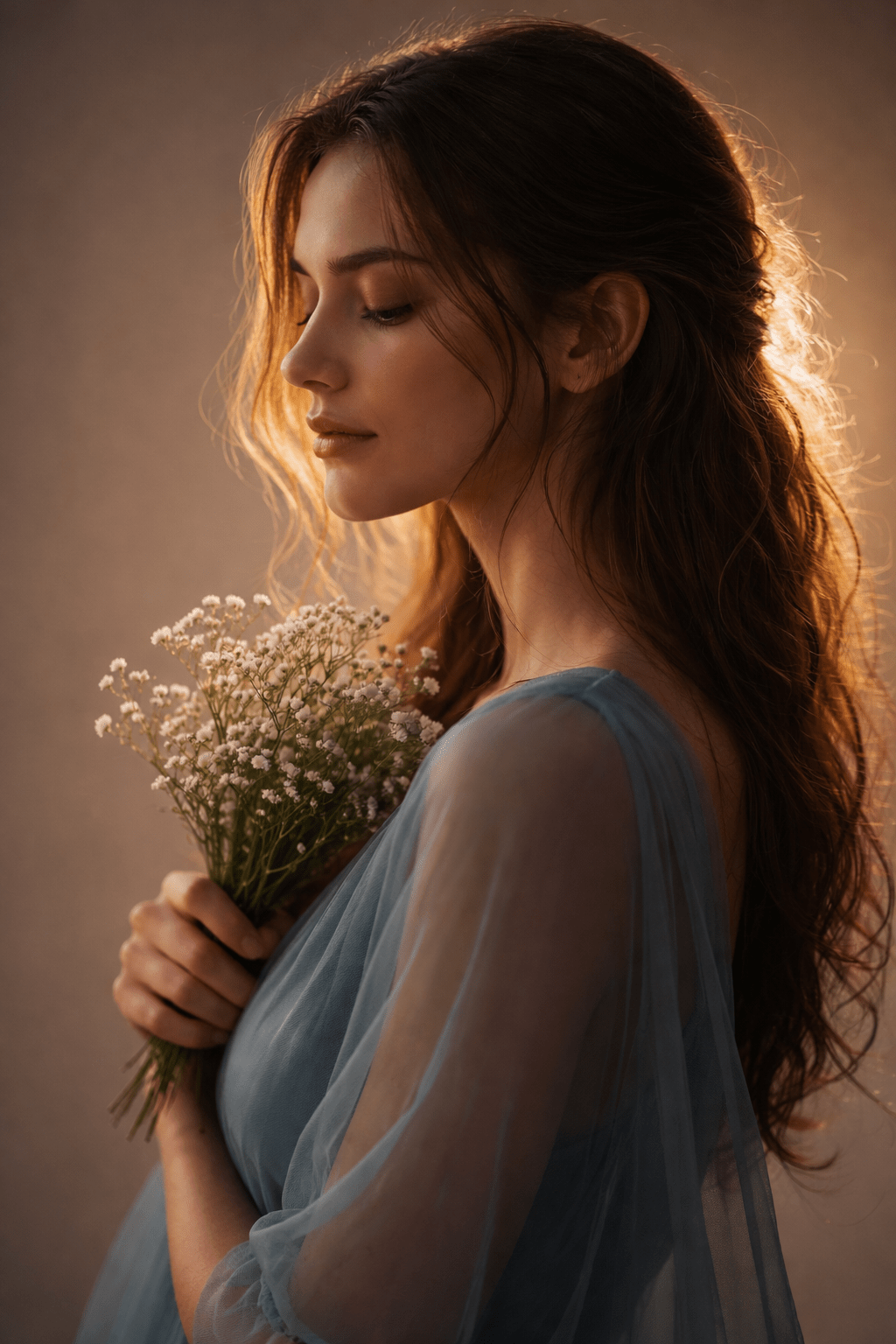 Ultra-realistic cinematic side-profile portrait of a young woman facing left, eyes gently closed, calm serene expression. She holds a delicate bouquet of small white flowers close to her chest. Soft warm backlight creating a glowing rim light through her slightly wet, loose hair. Wearing a flowing blue translucent dress. Minimal neutral background, moody fine-art lighting, shallow depth of field, high skin detail, 4:5 ratio. Image generate
