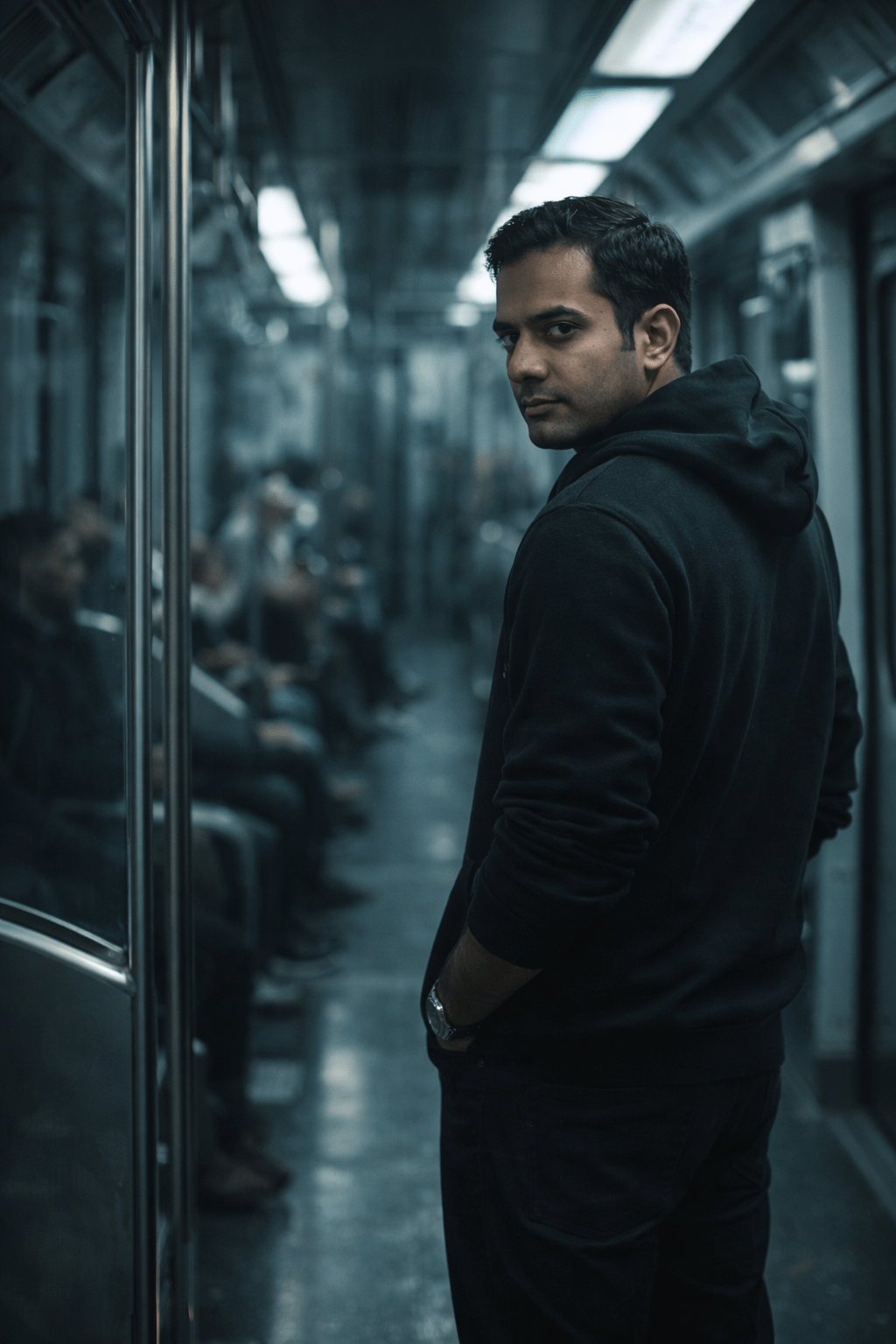 A moody, cinematic scene inside a modern subway train. A young man stands in the aisle, wearing a black hoodie, hands in pockets, looking slightly over his shoulder toward the camera. Soft, diffused overhead fluorescent lights reflect off metallic poles and glass surfaces. Shallow depth of field isolates the subject while other passengers sit blurred in the background, creating a sense of urban isolation. Cool color palette with desaturated blues and greys, subtle film grain, low contrast shadows, realistic skin texture. Shot on a full-frame camera, 50mm lens, f/1.8, eye-level angle, cinematic framing, realistic Lighting, high detail, dramatic atmosphere, photorealistic, movie still quality. Size 4 5 ratio image generate