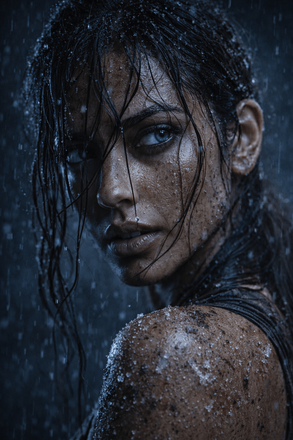 A close-up portrait, based on image_0.png, showing a young woman with wet, dark hair slicked across her face. Her head is tilted slightly to the left, but her large blue eyes are looking sharply towards the right. Her full lips are slightly parted. Her skin is covered in small particles of ice and snow, with raindrops and streaks falling across the frame. The lighting is cool, blue-toned, and moody. Size 4 5 ratio image generate