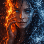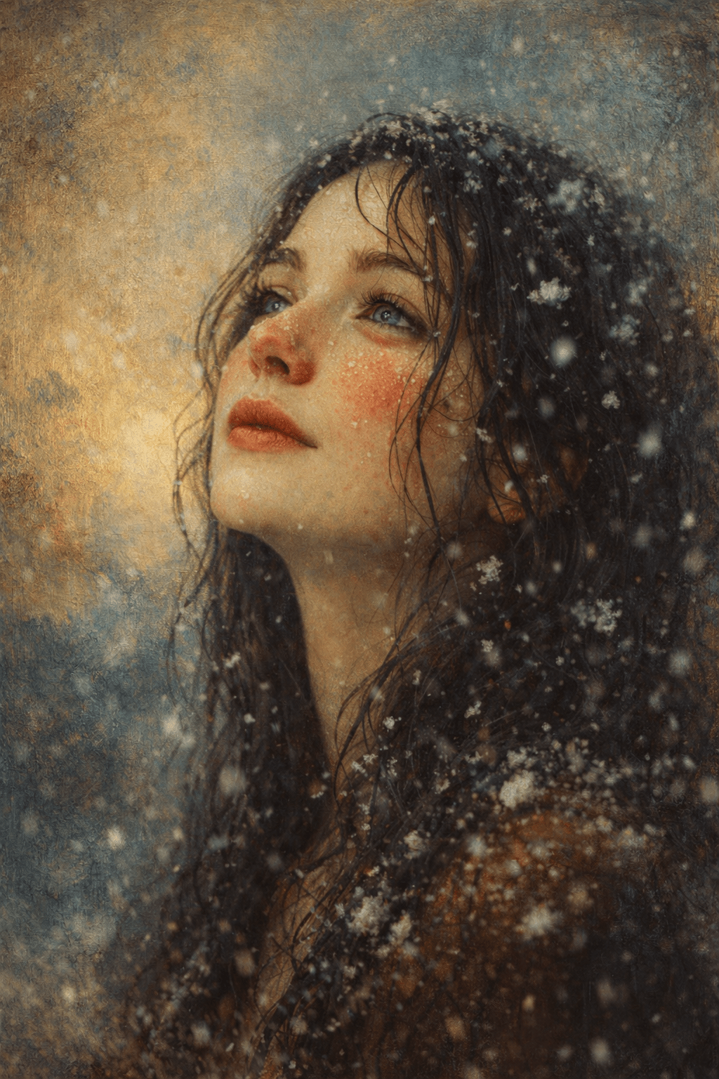 “Close-up portrait of a young woman in snowfall, head slightly tilted upward, eyes looking gently toward the sky, soft calm expression. Wet dark wavy hair framing her face, pale skin with rosy cheeks and nose from cold, natural red lips. Snowflakes resting on her hair and face. Warm golden and blue painterly background, visible brush texture, vintage oil painting style, soft diffused light, fine art illustration, high detail, vertical composition.” size 4 5 ratio image generate