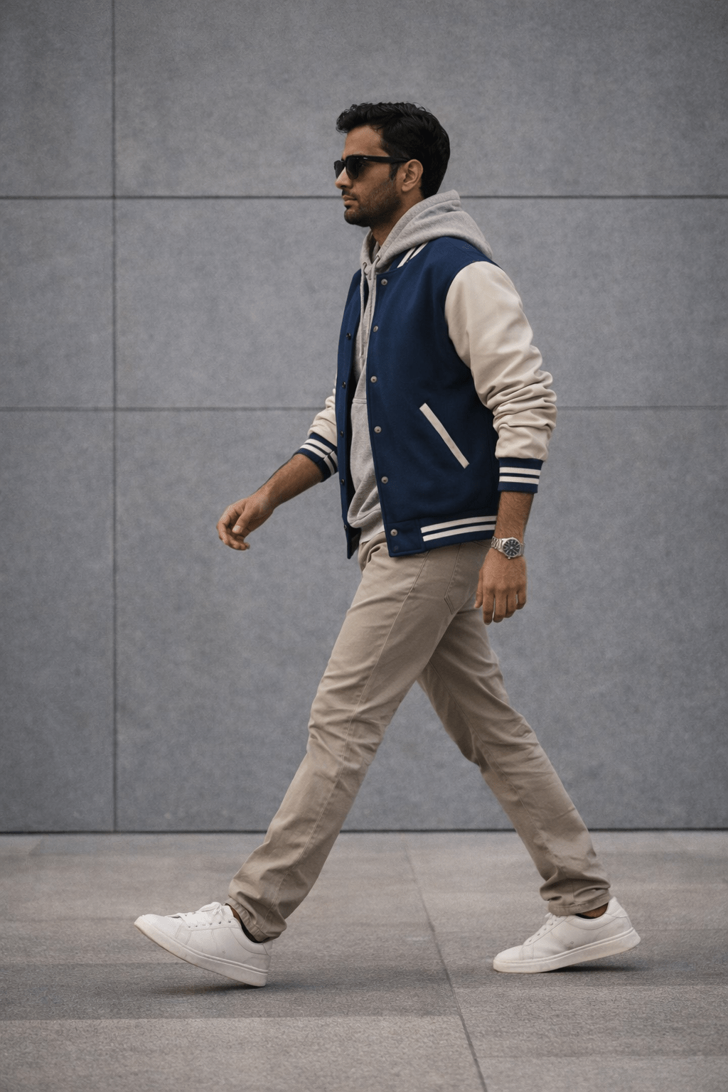 Ultra-realistic full-body side view of a stylish man walking confidently left to right, mid-step stride, arms relaxed, wearing blue varsity jacket with beige sleeves over hoodie, slim beige pants, white sneakers, sunglasses, modern gray wall background, clean pavement, cinematic street fashion photography, sharp focus, 4:5 ratio. Image generate