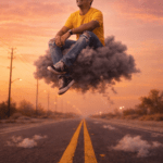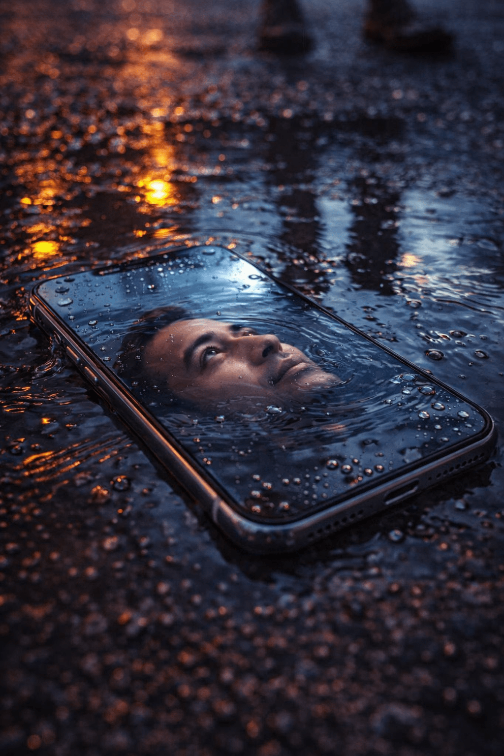 A hyper-realistic, 8k, cinematic low-angle shot captures a surreal scene: a modern smartphone lies face-up, partially submerged in a shallow puddle on a dark, textured asphalt surface. The phone’s screen appears to be filled with water, acting as a miniature pool where a face is floating, looking upwards with a contemplative expression, partially submerged with subtle ripples and water effects around it; uploaded face as reference. Numerous hyper-detailed water droplets cling to the phone’s screen and bezel, both inside the perceived water of the screen and on the dry parts of the phone. The surrounding puddle dramatically reflects blurred, dark blue and grey tones of the sky, along with striking, abstract orange light patterns that resemble distant streetlights or fire, creating a vivid contrast. In the upper portion of the puddle, blurred reflections of a person’s legs and feet are visible, adding depth and context to the scene. The composition emphasizes the layered reality and the interplay of light and reflection, with dramatic, volumetric lighting highlighting the water textures and the face, creating a highly detailed and conceptual image.