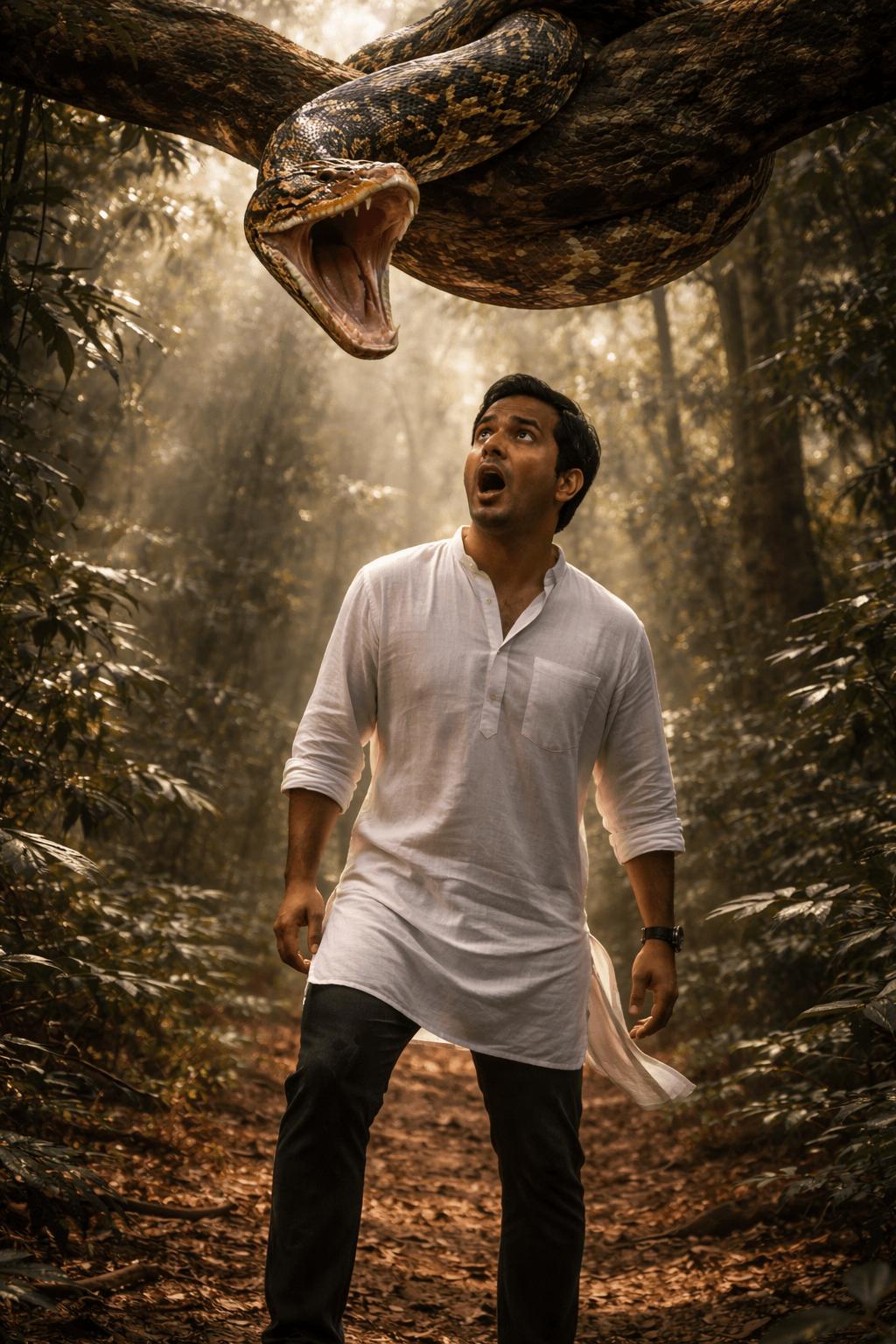 Ultra-realistic cinematic jungle scene, young man standing on forest floor looking up with shocked expression, legs slightly apart, arms relaxed at sides, huge python coiled on tree branch directly above with open mouth, dense tropical forest, sun rays through trees, dramatic natural lighting, detailed textures, photorealistic, shallow depth of field. Quality 8k size 4 5 ratio image generate