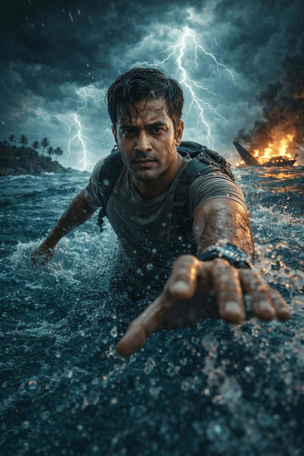 Camera & style: hyper-realistic, ultra-detailed skin texture, sharp facial focus, shallow depth of field, Hollywood movie still, extreme realism, volumetric clouds, HDR lighting, 8K quality, cinematic composition, intense survival adventure atmosphere, poster-quality realism, aspect ratio 4:5. Image generate