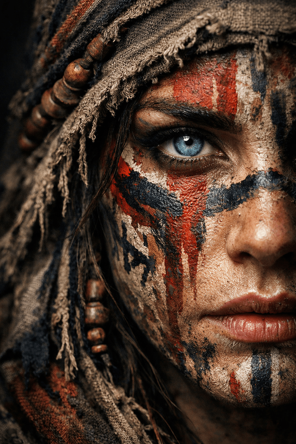 “A dramatic ultra-realistic portrait of a woman shown in extreme close-up, only half of her face visible. Her skin is painted with bold tribal markings in deep red, navy blue, and muted earth tones, layered with rough textures and symbolic patterns. One striking light-blue eye is sharply in focus, conveying strength, resilience, and quiet intensity. She wears weathered fabric and woven textiles around her head, with frayed edges and small wooden beads, suggesting ancient or nomadic culture. Cinematic lighting with soft shadows, shallow depth of field, dark neutral background, hyper-detailed skin texture, painterly realism, 8K quality, editorial poster style, moody and powerful atmosphere.”