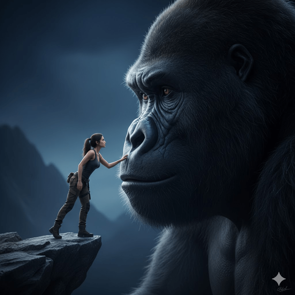 The scale difference is extreme: the woman appears tiny compared to the gorilla’s colossal face. Lighting is cinematic low-key, with soft moonlight and subtle volumetric haze. Background is minimal and atmospheric, deep blue tones, no distractions. Shot from a low angle to emphasize power and intimacy. Ultra-sharp focus, shallow depth of field, photorealistic textures, epic fantasy realism, 8K quality, dramatic cinematic color grading, no text, no watermark size 4:5 ratio 100% use my upload reference image image generate
