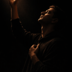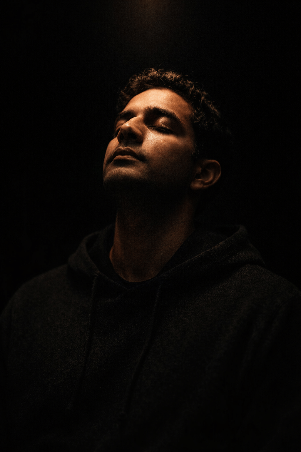 Ultra-realistic cinematic portrait of a young man captured from chest-up, standing in a dark, minimal studio environment. The subject’s head is tilted upward, chin slightly raised, eyes softly closed or gazing toward the light above, creating a feeling of surrender and introspection. A single warm spotlight from directly overhead illuminates the forehead, nose bridge, lips, and cheekbones, while the rest of the face and body fall gradually into deep shadow. Hair is short, textured, and naturally styled, subtly glowing at the edges due to the top light. Skin texture is hyper-realistic with visible pores and soft highlights. He wears a dark hoodie or jacket that blends into the black background. Strong contrast, dramatic chiaroscuro lighting, cinematic grain, shallow depth of field, moody atmosphere, professional DSLR photography, no text, no watermark, 4:5 aspect ratio, 8K quality. 100% use my upload reference image image generate