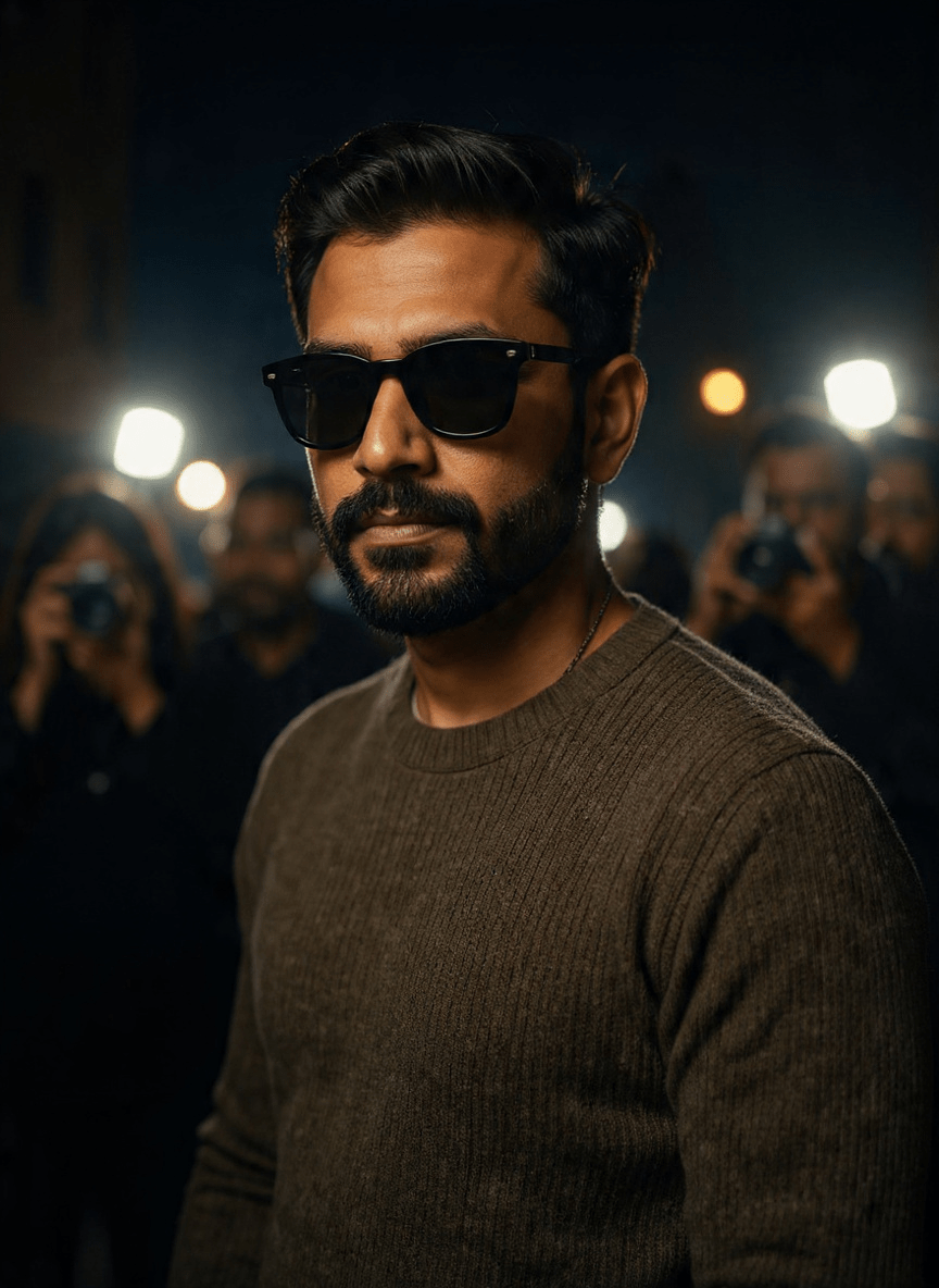 Ultra-realistic cinematic street-style portrait of a different young South Asian man (completely new face, not resembling any reference model) captured in the exact same pose and composition — three-quarter over-the-shoulder look, head slightly turned back toward the camera. He wears dark classic sunglasses and a textured brown knit sweater. Expression is calm, confident, and mysterious. Hair is neatly styled with natural volume, beard trimmed differently from the reference to ensure a unique identity. Background features a blurred crowd of photographers and people holding cameras, strong paparazzi vibe with camera flashes and bokeh lights. Lighting is dramatic and cinematic, sharp focus on the subject’s face, shallow depth of field, realistic skin texture, natural tones, high contrast. DSLR photography look, ultra-detailed, 8K quality, vertical composition, professional fashion-editorial style. Size 4:5 ratio 100% use my upload reference image image generate .