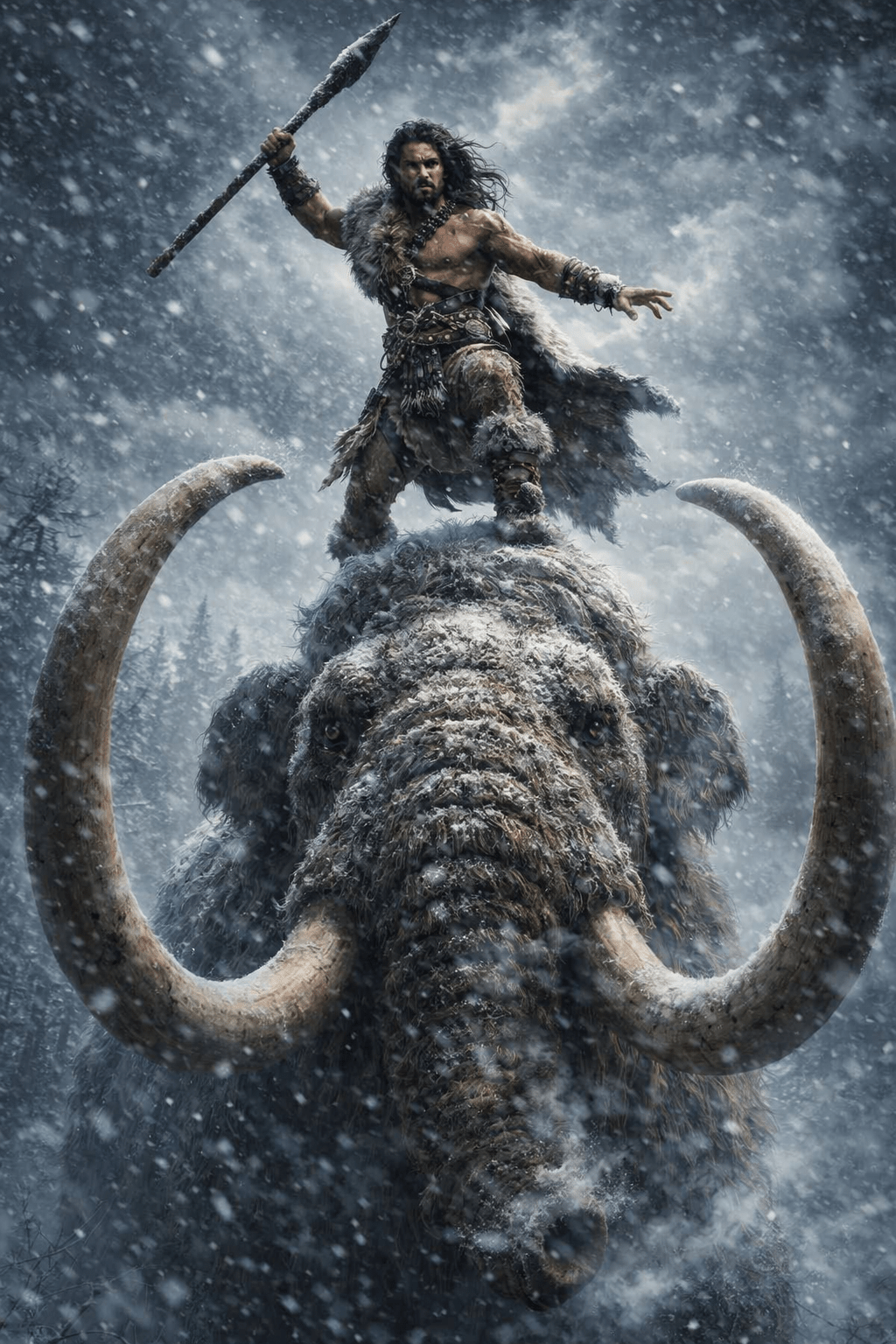 “Ultra-realistic cinematic prehistoric fantasy poster. A powerful muscular male tribal warrior with long wild hair and light beard is standing heroically on the head of a massive woolly mammoth between its huge curved tusks. One leg forward, one bent, body balanced. He is holding a primitive stone-tipped spear raised in his right hand, left arm stretched outward for balance, intense focused warrior expression. He is wearing fur and leather battle clothing, fur boots, arm wraps, tribal belts.