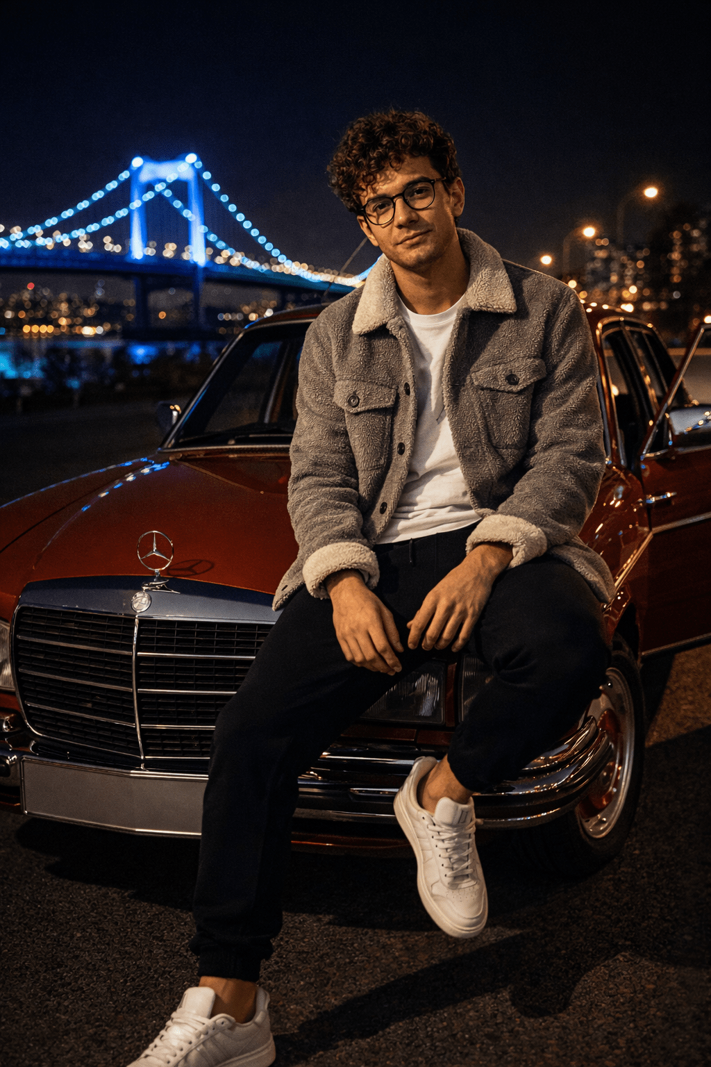 A young man with curly brown hair and glasses, wearing a grey shearling button-up jacket, white t-shirt, black joggers, and white sneakers, is sitting casually on the hood of a classic red Mercedes-Benz sedan. He is looking directly at the camera with a slight smile. The car door is open. The scene is outdoors at night, with a large, blue-lit suspension bridge and city lights reflecting over a body of water in the background. The asphalt is dark, and the lighting is a mix of city lights and street lamps. Quality 8k Size 4:5 ratio Quality 8k 100% use my upload reference image image generate